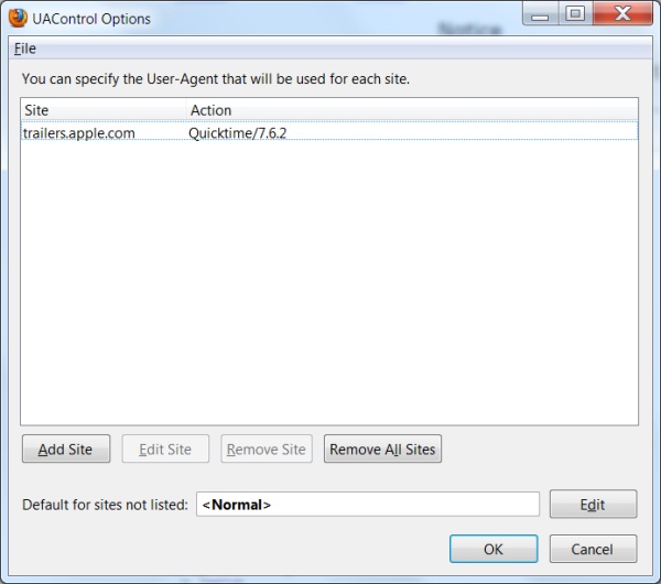 UAControl by KAKINUMA Ryoumei allows you to setup Firefox to switch user-agents whenever you visit or download via chosen urls. Follow the link and install the add-on, then access the add-on settings by clicking 'UAControl' via the Tools menu. Now click 'Add Site' and enter trailers.apple.com in the site field, click the 'custom' radio button and enter Quicktime/7.6.2 and finally click OK. With that done every time you visit the Apple Trailers page or download trailers from my site Firefox will automatically switch to the correct user-agent. |